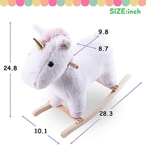 • P PURLOVE Stuffed Animal Rocking Horse Toy, White Unicorn Rocker for Kids, Plush Rocking Animals w/ Seat Belt & Wood Handle, Child Birthday Gift (White Unicorn)