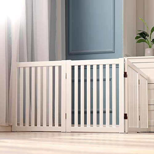 • WELLAND Wooden Freestanding Pet Gate, 4 Panel 24 Inch Step Over Fence, Expands Up to 80" Wide, Foldable Indoor Dog Gate Puppy Safety Fence, White