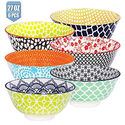 • E-Gtong 27OZ Hand-Painted Cereal Bowls Set of 6, Multicolor Porcelain Ceramic Soup Bowls for Pasta, Soup, Salad and Rice, Microwave & Dishwasher Safe