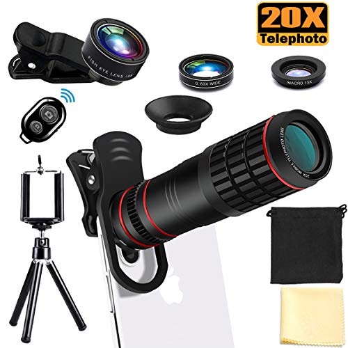 • Phone Camera Lens Kit, 20X Telephoto Lens with Tripod, Shutter Remote, 198° Fisheye Lens, 0.63X Super Wide Angle Lens & 15X Macro Lens, Compatible with iPhone X Xs Xs Max XR 8 7 6 6s Plus Samsung