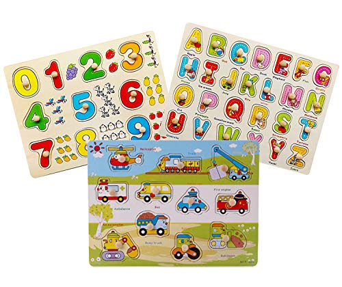 • Wooden Peg Puzzles Set, 3 Set Knob Puzzles, Alphabet ABC Numbers 123 Vehicles Wood Puzzles for Kids Toddlers Aged 3