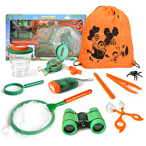 • Mixi Outdoor Explorer Kit & Bug Catcher Kit with Binoculars, Flashlight, Compass, Butterfly Net, Magnifying Glass and Whistle Kids Adventure Kit Gift for Boys & Girls Age 3-12 Year Old Camping Hiking