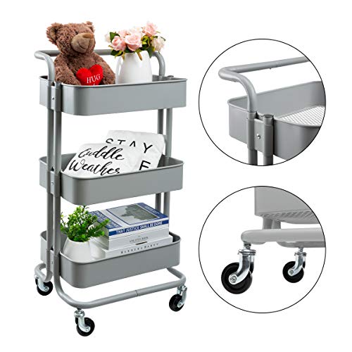 • HollyHOME 3-Tier Metal Utility Service Cart Rolling Storage Shelves with Handles, Gray Storage Utility Cart