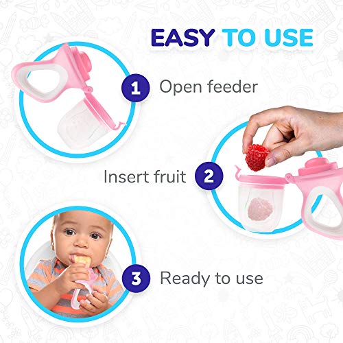 Baby Food Feeder Pacifier - (2 Pack) - Fruit Feeder - Best Infant Teething Toy Nibbler Teether with Silicone Food Pouches - Appetite Stimulating Colors by Dream on, bright pink & aqua marine combo with white
