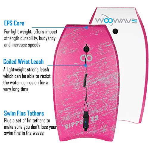 • WOOWAVE Bodyboard 33-inch/36-inch/41-inch Super Lightweight Body Board with Coiled Wrist Leash, Swim Fin Tethers, EPS Core and Slick Bottom, Perfect Surfing for Kids Teens and Adults(41 inch, Pink)