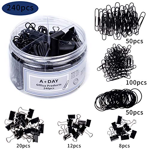 A+DAY 240 pcs Binder Clips, Paper Clips, Rubber Bands, Paper Clamps Assorted Size, Jumbo Paper Clips, Small Paper Clips, Large Binder Clips, Medium Binder Clips, Small Binder Clips (Black) Item Sku: