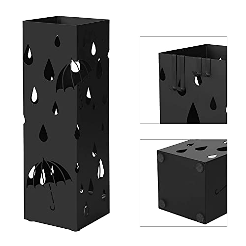 • SONGMICS Metal Umbrella Stand, Square Umbrella Holder with Water Tray and Hooks, 6.1 x 6.1 x 19.3 Inches, Black ULUC49B