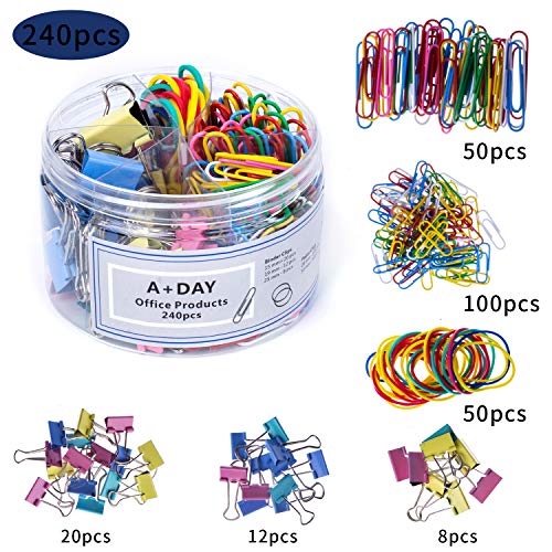 A+DAY 240 pcs Binder Clips, Paper Clips, Rubber Bands, Paper Clamps Assorted Size, Jumbo Paper Clips, Small Paper Clips, Large Binder Clips, Medium Binder Clips, Small Binder Clips (Colored) Item Sku: