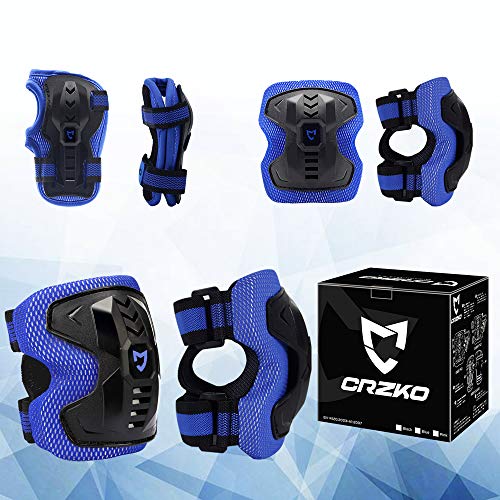 CrzKo Kids/Youth Protective Gear, Knee Pads and Elbow Pads with Wrist Guards, 6 in 1 Protective Gear Set, BMX Bike Inline Roller Skates Cycling Skateboard Inline Scooter Riding Sports, Blue, Medium