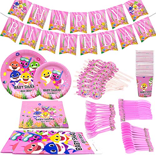 • Topivot Baby Cute Shark Party Supplies,Little Shark Tableware Party Decoration,Includes Table Cloth 7"Plate 9"Plates Napkins Cups Forks Knives Spoons Straws, Serves 20 Guest (Pink)