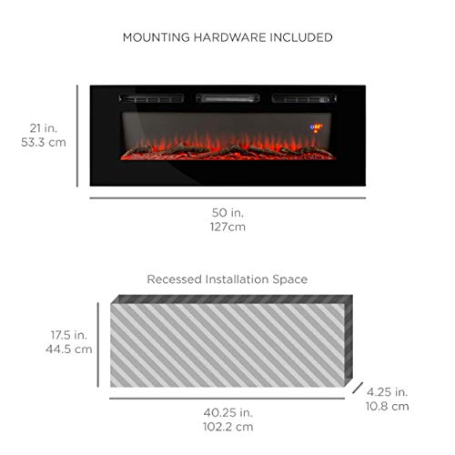 • Best Choice Products 1500W 50in Electric Fireplace Heater Recessed and Wall Mounted w/Remote, Logs, Crystal Stones, 3 LED Flame Colors, Touch Screen