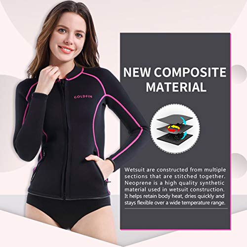 • GoldFin Womens Wetsuit Top, 2mm Neoprene Wetsuit Jacket Long Sleeve Wetsuit Tops with Zipper Pockets for Water Aerobics Diving Surfing Swimming (Black, L)