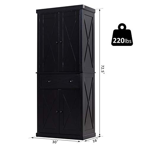 • HOMCOM 6ft Wood Farmhouse Colonial Kitchen Pantry Cabinet, with Adjustable Shelves, 2 Wood Pantries, a Drawer, Black
