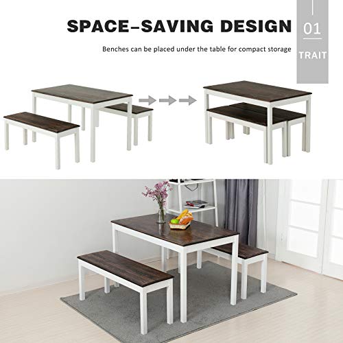 Mecor 3-Piece Dining Set Table with 2 Benches, Solid Pine Wood Tabletop and Benches for Home Kitchen Dining Room Furniture (White/Brown)