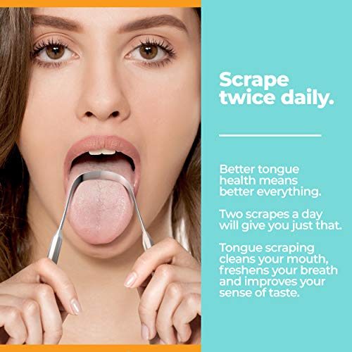 • Tongue Scraper (2 pack), Reduce Bad Breath (Medical Grade), Stainless Steel Tongue Scrapers for Adults & Children - 100% BPA Free Metal Tongue Cleaner for Adults, Achieve Fresher Breath in Seconds