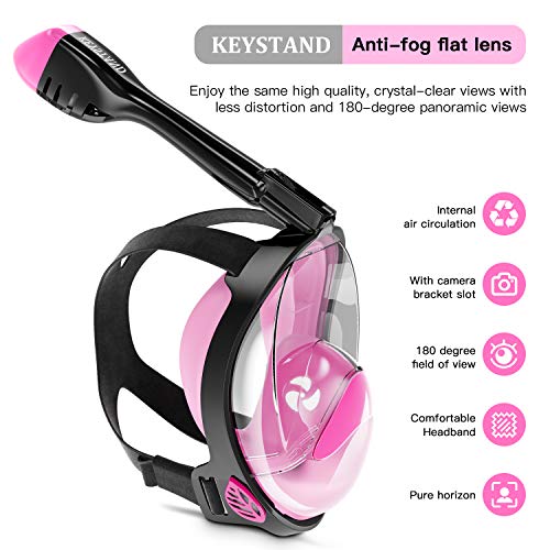 Keystand Full Face Snorkel Mask,Breathing Mechanism Snorkeling Masks for Kids Adults,Flat Crystal Lens,180° Panoramic Anti-Leak/Anti-Fog Mask and Snorkel with Detachable Camera Mount, Pink/Black, Medium