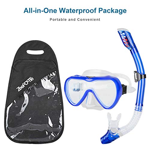 • ZEEPORTE Snorkel Set, Anti-Fog Tempered Glass Panoramic Diving Mask, Dry Top Snorkel Gear with Purge Valve and Anti-Splash Guard, Watertight Anti-Impact Snorkeling Mask for Adults (Blue, Medium)