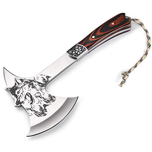 • LIANTRAL Camping Hatchet Axe Etched Wolf Head Stainless Steel with Wooden Grip & Nylon Sheath Outdoor Hunting Survival Tactical Axe for Outdoor Hunting Camping