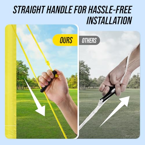 Patiassy Volleyball Net Set System with Quick & Easy Setup Adjustable Height Steel Poles, PU Volleyball with Pump and Carrying Bag for Beach, Backyard and Grass Regulation Size Volleyball Net (32'L x 3'H): The 24-ply PE net (not 18-ply like others) is strong and tear-resistant to withstand the high impact of the volleyball shots while playing. The beach volleyball net is reinforced with 3-inch side tapes and 1.5-inch top & bottom net tape for shape retention after repeated use and the durable 12 side straps can help to keep the net stable and minimize sagging. High Quality Volleyball: This 8.5" machine-stitched volleyball has soft touch PU cover, which lessens the impact on your arms and hands. While construction of yarn winding inside gives it extra durability for longer life. Height Adjustable volleyball net with Poles: The black powder-coated poles are sturdy enough to offer maximum stability to the net. Push-button locking system allows for quick setup and Eye Bolt system makes it easier to adjust the net to 3 different heights for men's (8'), women's (7'4'') and co-ed (7'8'') playing heights. Ease of Use: This outdoor volleyball net set comes with a durable 600D oxford carrying bag which allows for easy storage and transportation.