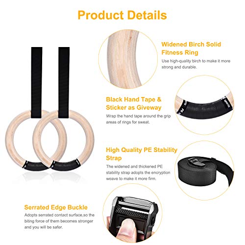 • Wooden Professional Gymnastic Fitness Rings with 15ft Adjustable Buckle Straps Anti-Slip Sweat-Absorbent Hand Tape Exercise Rings for Cross-Training Workout,Gymnastics,Fitness,Bodybuilding,Pull-Ups