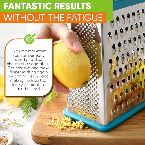 • Spring Chef Handheld Stainless Steel XL Parmesan Cheese Grater with Handle - 4 Sided Metal Box Grater for Kitchen - Dishwasher Safe Potato Shredder for Hash Browns, Potato, Carrot, Vegetables - Teal
