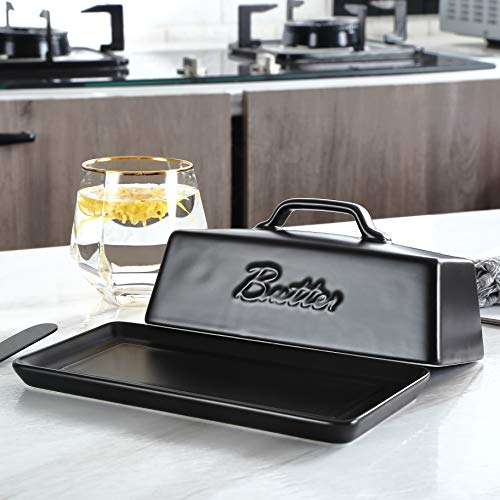 • Bruntmor Elegant Porcelain Butter Dish with Lid, Covered Butter Keeper - Handle Design - Dishwasher Safe, 7.5 Inch Wide, Black