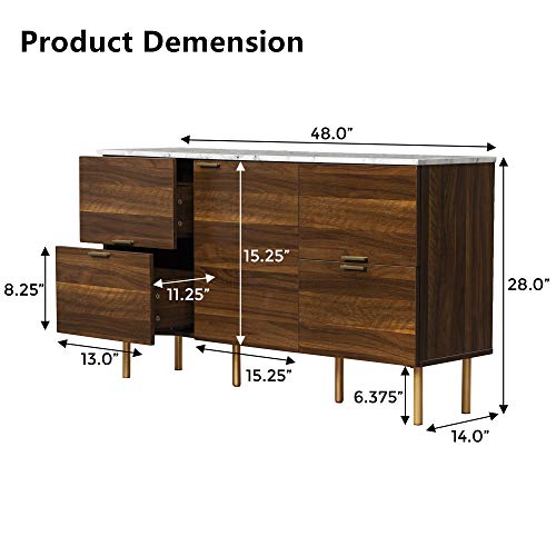 GOOD & GRACIOUS Sideboard Cabinet, Mid Century Modern Console Storage Buffet Credenza Cabinet, Faux Marble Top with 4 Drawers and 1 Door for Living Room, Kitchen, Ding Room or Entryway, 48", Walnut