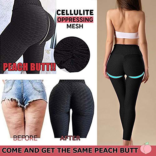 POWERASIA High Waisted Yoga Pants for Women, Tummy Control Ruched Butt Lifting Workout Scrunch Leggings Booty Tights, 2# Textured Black, Large