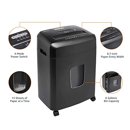 Amazon Basics 15-Sheet Cross Cut Paper Shredder for Home and Office, CD/Credit Card Shredder with 6 Gallon Wastebasket, Black, 15 Sheet