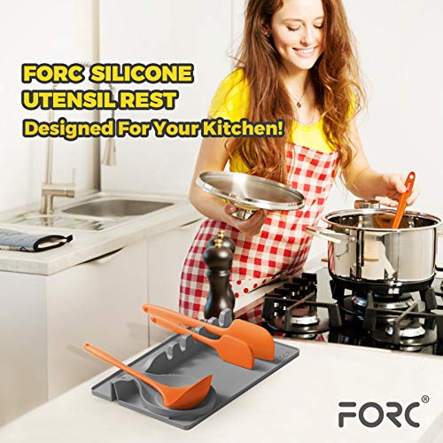 • Forc Silicone Spoon Rest 2 in 1 Larger Size Silicone Spoon Holder for Stove Top, Upgraded Utensil Rest with Drip Pad Include 5 Slots & 1 Spoon Holder, Easy to Clean, Hang Hole Design, Grey