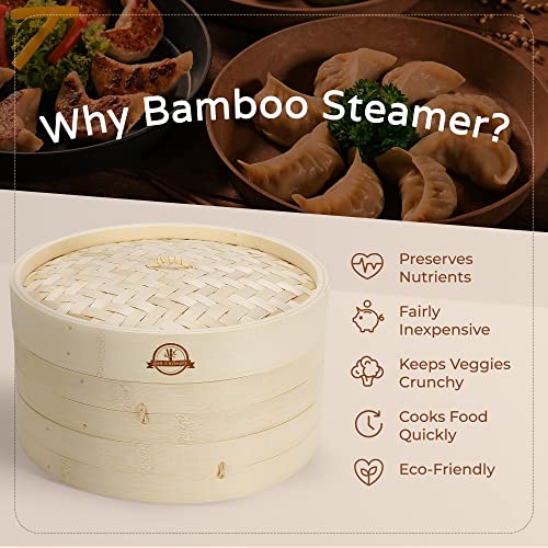• Bamboo Steamer basket 10 inch 2-Tier for Bao Bun steamer,Asian Food, Dim Sum, Chinese Dumpling Steamer, Rice & Vegetables Set with 2 Pairs of Chopsticks, 50 Paper Liners & 1 Sauce Dish - Zen Culinary