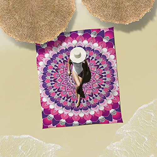 • Sunlit Silky Soft 85"x72" Boho Sand Proof Beach Blanket Sand Proof Mat with Corner Pockets and Mesh Bag for Beach Party, Travel, Camping and Outdoor Music Festival, Purple Pink Flower Mandala