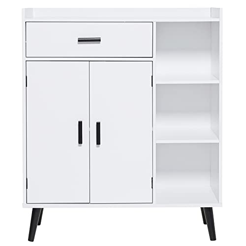• USIKEY Mid Century Storage Cabinet with 1 Drawer & 3 Shelves, Wood Storage Cabinet with 2 Doors for Living Room, Bedroom, Home Office, White