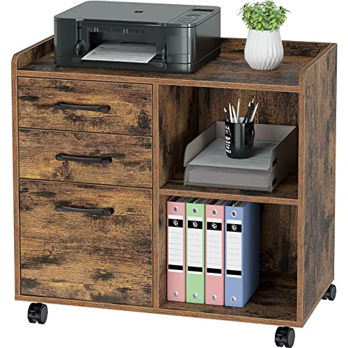 Seventable File Cabinet 3-Drawer, Mobile Lateral Printer Stand with Open Storage Shelf, Rolling Filing Cabinet with Wheels for A4/Letter Size,Rustic Brown