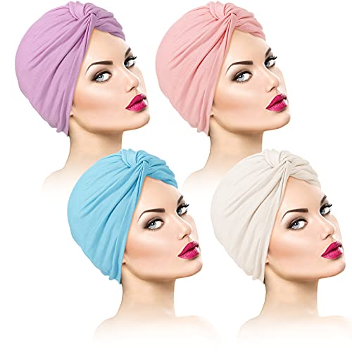 • SATINIOR 4 Pieces Turbans for Women Soft Pre Tied Knot Fashion Pleated Turban Cap Beanie Headwrap Sleep Hat, 4 Colors (Blue, Purple, Pink, White)