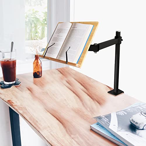 • Book Stands Height Adjustable, wishacc Table Side Bamboo Reading Mount Holder with Clamp - Sturdy Desktop Cookbook Rest with Page Clips for Reading Hands Free 13.2 x 9.2 inch