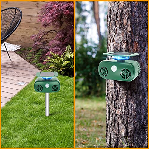 • 2022 Solar Rechargeable Ultrasonic Animal Repeller, Waterproof Pets Deterrent, Motion Activated Repellent with 360°Strobe Light, Ultrasonic & Owl/Alarm Sound Deter Stray Cats, Dogs, Foxes, Squirrel.