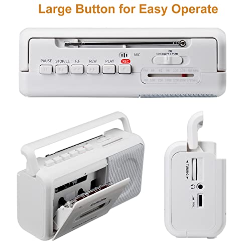 Gelielim Cassette Player Boombox, Portable AM/FM Radio Stereo, Cassette Tape Player Recorder with Big Speaker and Earphone Jack, Battery Operated or AC Powered Tape Recorder Cassette Player, White, KT-3B