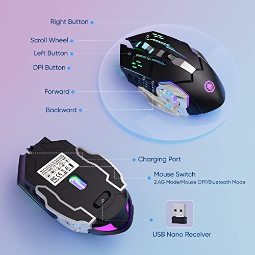 • Wireless Gaming Mouse Bluetooth Mouse RGB Rechargeable 2.4G USB Cordless Computer Mice with 7 Color Backlit, 6 Buttons & Silent Click for Laptop, iPad, Mac OS, PC, Windows -Black