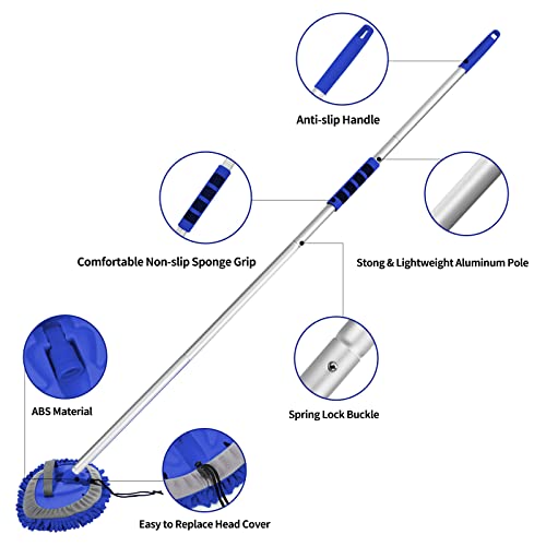 Wontolf 62'' Car Wash Brush with Long Handle Chenille Microfiber Car Wash Mop Mitt Kit Scratch-Free Car Detailing Cleaning Brush Care Kit with Replacement Head Supplies for Cars RV Truck Boat, Blue, 9P