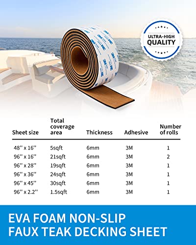 • OCEANBROAD Self-Adhesive 96''x2.4'' Boat Flooring with 3M Adhesive Backing EVA Foam Faux Teak Marine Boat Decking Sheet for Jon Motor Boats Yacht Helm Pad Floor, Brown with Black Seam Lines