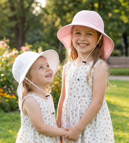 • 2-Pack Toddler Baby Sun Hat Summer UPF 50+ Protection for Boys Girls Kids Adjustable Beach Hats with Bucket Wide Brim Age 1-7 Years Outdoor(Small,Pink + White)