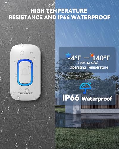 • TECKNET Longest 1300 Feet Wireless Doorbell with RGB Alarm Lighting,Battery-Powered IP66 Waterproof Design,60+Chimes & 5-Level Volume for Home/Apartment/Classroom/Business,4.5-Year Battery Life,White