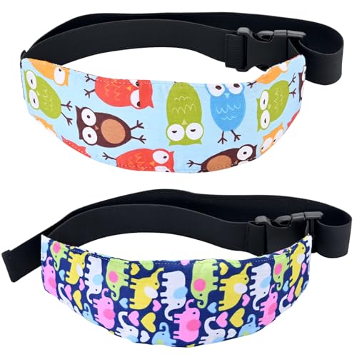 Luckyiren Head Support for Stroller Car Seat - Head Band Strap Headrest for Sleeping Traveling for Toddler Kids Children Child Baby Infant- (Elephant+Blue), 2 Pack; Owl+Elephant