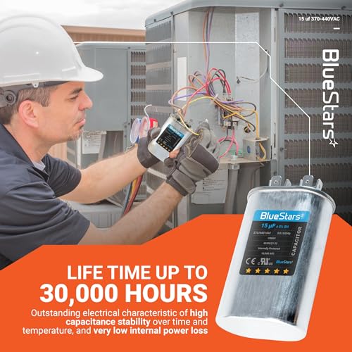 [UL Certified] BlueStars 15 uF MFD 370-440V Oval Run Start Capacitor CBB65 – Replacement for AC Motor, Condenser, and Heat Pump Air Conditioners - Replace TRCF15 PRCF15A CAP-15-450 - Pack of 2