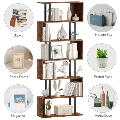 Yusong Geometric Bookcase, S Shaped Bookshelf 6-Tier Book Shelves for Bedroom, Modern Wood Decorative Display Shelf Tall Book Case for Home Office, Bown and Black, Rustic Brown, 27.8"W x 9.3"D x 74.4"H