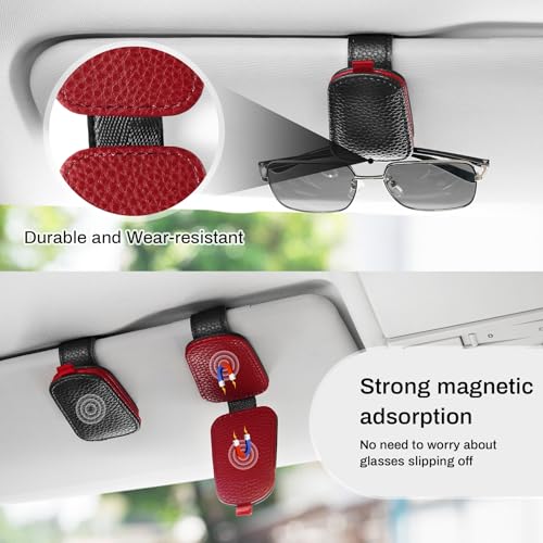 • SINGARO Sunglasses Holder for Car, Leather Magnetic Buckle Sun Visor Sunglass Clip, Ticket Card Storage Glasses Clip, Car Interior Accessories for Men and Women(Black-red)