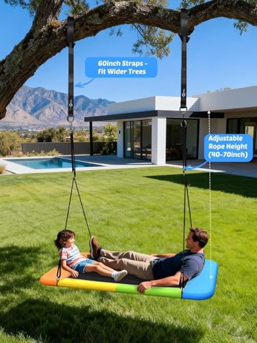 • Trekassy 60" Rectangle Platform Tree Swing for Kids Adults, 700lb Capacity Outdoor Giant Swing, 900D Oxford Waterproof Flat Swings with 2 Hanging Straps for Backyard (Rainbow)