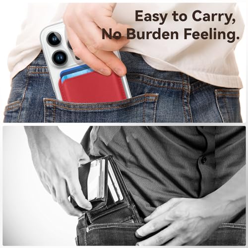 • Amzone Stronger Magnetic RFID Leather Mag-Safe Card Holder for iPhone 16 Series, Mag-Safe Accessories Stick on Series of iPhone 17/16/15/14/13/12 and Pro/Promax, Red