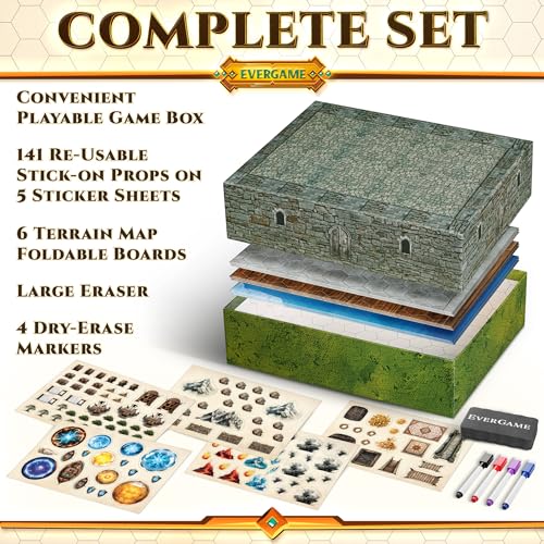 • 10 DND Game Mats and a lot More - Includes 6 Dungeons & Dragons Board Game Battle Maps (1" Hex Grid), Huge Size 22x26-4 3D Battle Arenas, 140+ Reusable Stickers, 4 Markers & Eraser, by EverGame
